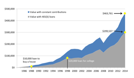 Assumptions: The 401(k) participant began contributing to his account at the beginning of 1985. His starting salary was $30,000, with a 2.25-percent pay raise each year, and he contributed 6 percent of his salary to the account annually. The company matched 50 percent of his annual contribution at the end of each year. The participant’s investments were allocated between the S&P 500 (60 percent) and the Barclays Capital U.S. Aggregate Bond Index (40 percent). In the scenario where 401(k) loans were taken, the participant paid back both loans annually over four years, was assessed annual interest of 5 percent on the loans, and did not contribute to his 401(k) during those years. The first loan, for $10,000, was taken in January 1988 to help purchase a house and was paid back by December 1991. The second loan, for $20,000, was taken in January 1998 to help finance a child’s college tuition and paid back in December 2002.